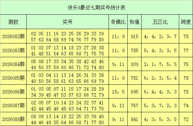 福彩兴奋8第2026088期开出奖号:08 09 13 14 18 22 25 33 39 40 44 46 49 55 64 66 68 71 77 80,其中奖号奇偶比为9:11,和值为841,跨度72,五区比为4:3:5:3:5。